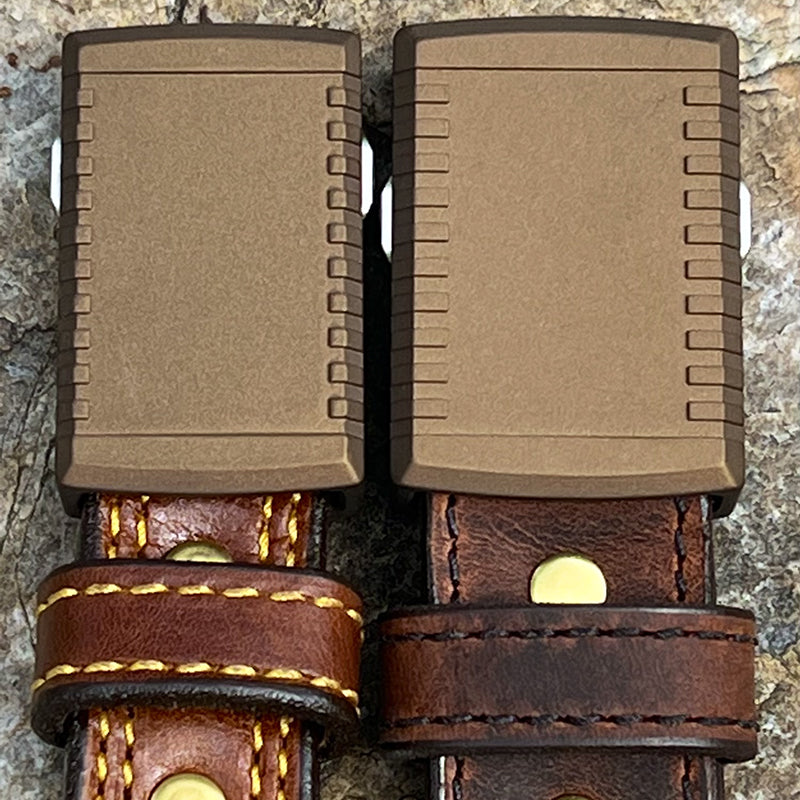The Renegade buckles are made of Aerospace Type 3 Hardened Anodized Aluminum. Sliding bar assembly made of Stainless Steel. Anti-slip grooves cut into the sliding bar to prevent slippage.