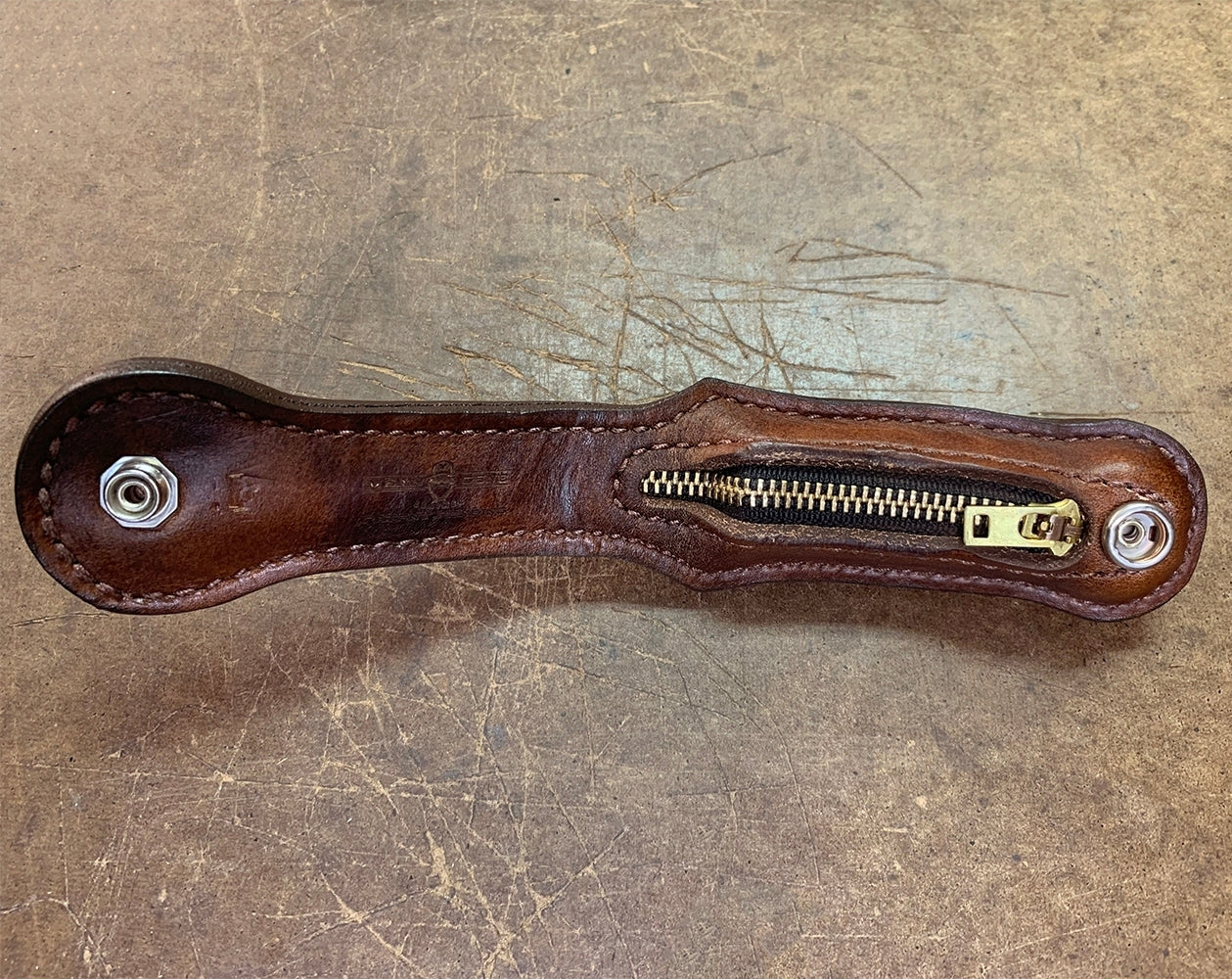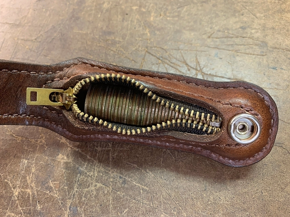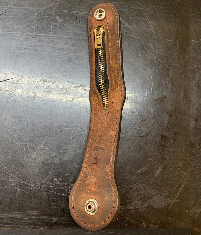 The MGL Sloppy Seconds “S2” was designed primarily as a “Coin Purse” to be carried on the belt where it is readily available in time of need. The S2 is for spare change, but can also be to use as personal defense if necessary. As it’s a “Coin Purse”, it may be carried where other lethal weapons are not permitted by laws.  The flap of the “Coin Purse” folds over to protect the zippered opening and doubles as the belt loop to be worn on a persons belt for effortless extraction. This flap is also secured by a Directional Security Snap which prevents accidental release if snagged upon to prevent loss.  Handmade construction with US High Quality Leathers, Zipper and Security Snap are made of brass. Measures 10″ long opened, 4.5″ folded, 1.5″ wide when filled and 2″ wide empty. Weighs approximately 12oz. loaded with $12.00 in US quarters.